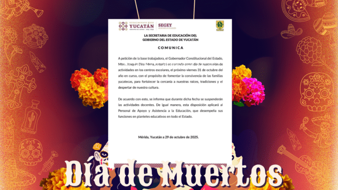 MÉRIDA, Yucatán, 29 de octubre de 2025.– La Secretaría de Educación del Gobierno del Estado de Yucatán (Segey) anunció la suspensión de actividades escolares el próximo viernes 31 de octubre, esto a petición de la base trabajadora y con la autorización del gobernador Joaquín Díaz Mena.