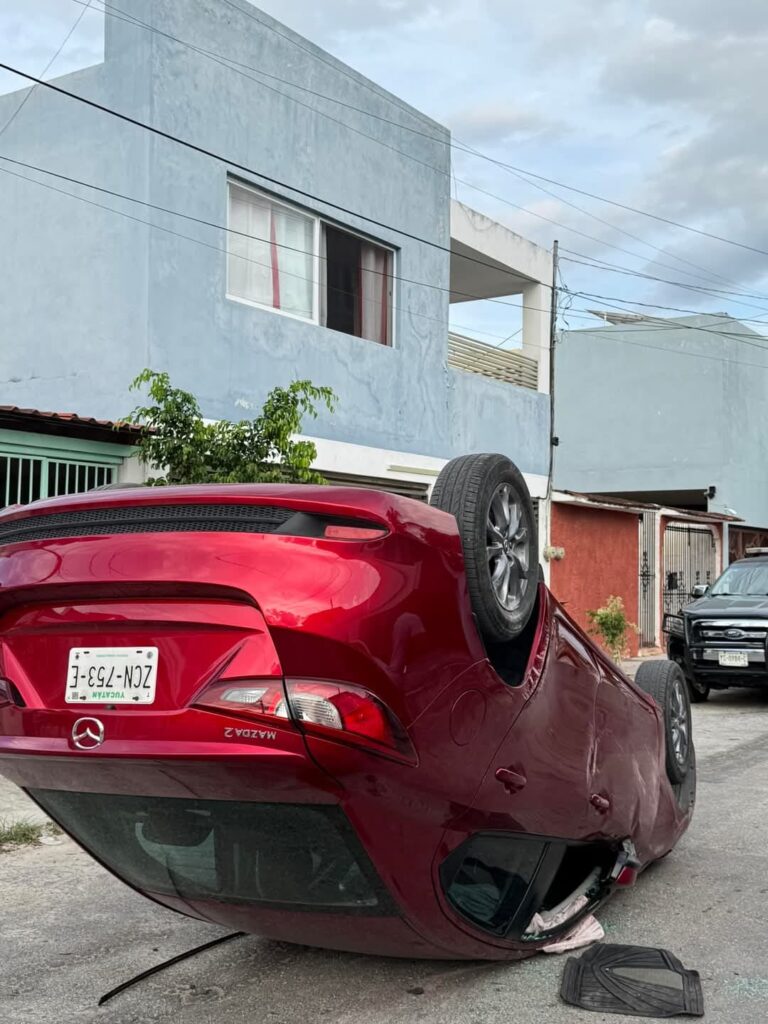 Herido por volcadura en calles del norte de Mérida, tras un fuerte accidente; alrededor de las 4 de la tarde en el fraccionamiento Residencial del Norte un automóvil color rojo de la marca japonesa Mazda, placas ZCN-753-E del Estado de Yucatán, terminó invertido sobre el asfalto como saldo una persona herida.