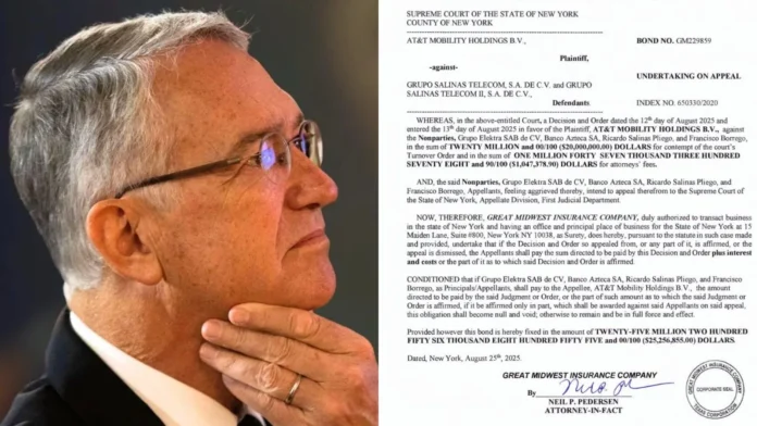 La sanción contempla 20 millones de dólares por desacato civil y más de un millón en costos y honorarios legales de AT&T, derivado de una sentencia emitida el 22 de septiembre de 2025. La corte responsabiliza de manera conjunta a Ricardo Salinas, Grupo Elektra, Banco Azteca y Francisco Borrego, por no cumplir con la entrega de activos ordenada desde 18 de julio de 2024.