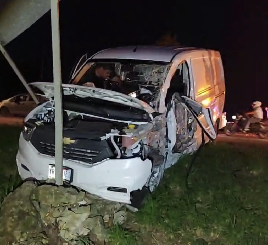 Una camioneta terminó gravemente dañada anoche luego de estrellarse contra un poste de alumbrado público y una señalética en el Anillo Periférico Sur de Mérida, justo a un kilómetro del punto donde, minutos antes, una motocicleta fue arrollada por un tráiler.