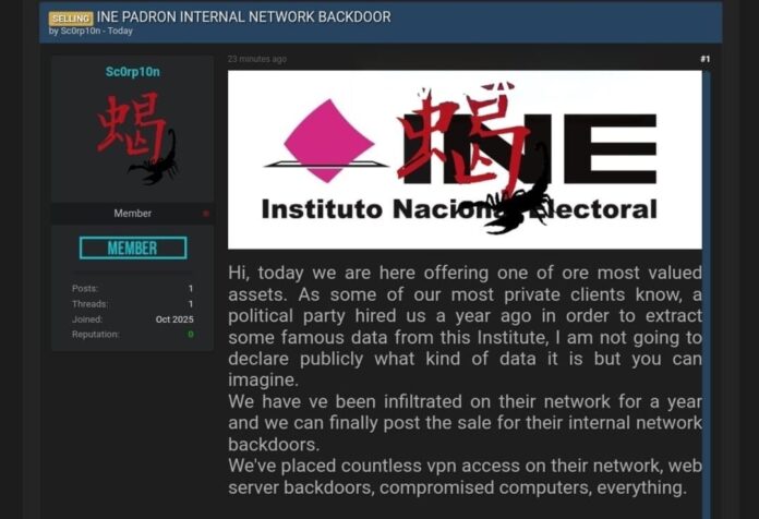 El colectivo de ciberdelincuentes conocido como Scorpion ha vulnerado los sistemas del Instituto Nacional Electoral (INE), extrayendo miles de datos sensibles que ahora oferta en foros oscuros. Se trata, según análisis preliminares, del ataque más grave sufrido por el INE en su historia reciente, y se suma a la lista de masivas filtraciones que el mismo grupo cometió contra entidades estatales como la Fiscalía General de Nuevo León y el Instituto Mexicano del Seguro Social (IMSS).