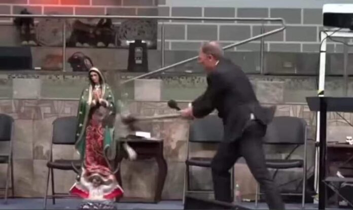 En un polémico incidente que ha generado gran controversia en las redes sociales, el pastor Dr. Kevin T. Wynne, perteneciente a la secta denominada “Bautista Fundamental Monte Sion”, fue captado en video utilizando un hacha para destrozar la imagen de la Virgen de Guadalupe, considerada la patrona de México.