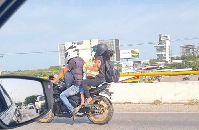 Una foto tomada en la salida de City Center, sobre el Periférico de Mérida, ha desatado la molestia en redes sociales. En la imagen, se aprecia a un motociclista que lleva a bordo a una mujer y dos menores, realizando una maniobra temeraria.