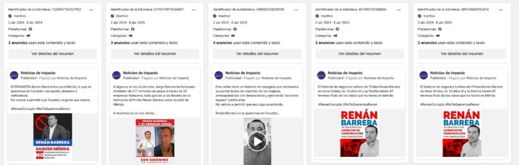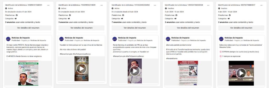De acuerdo con una investigación realizada por el PORESO se detectó que el portal denominado “Noticias de impacto”, durante la primer semana de abril gastó más de 200 mil pesos en alrededor de 10 contenidos en facebook para circular noticias contra el candidato del PAN. Así como se detectó que dicha página replicó los mismos contenidos en sus cuentas de intagram y X.