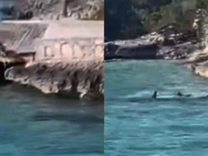 Pasajeros de Exuma Water Sports realizaron un recorrido de cuatro horas por el mar de las Bahamas cuando al pasar por un muelle presenciaron el momento cuando el perrito de color negro con marrón corrió al agua y se lanzó sobre un tiburón martillo.