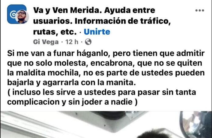 “Si me van a funar háganlo, pero tienen que admitir que no solo molesta, que no se quiten la mochila, no es parte de ustedes pueden bajarla y agarrarla con la manita. (incluso les sirve a ustedes para pasar sin tanta complicación)”, señaló el usuario en su mensaje.