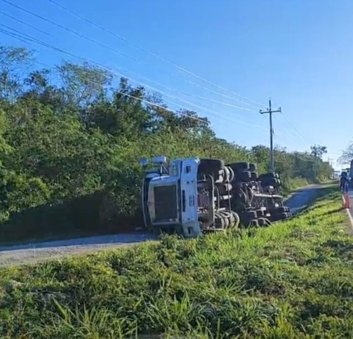 Esta mañana, se reportó una volcadura de un tráiler de carga en el tramo Valladolid-Ticuch, en la carretera Mérida-Cancún.